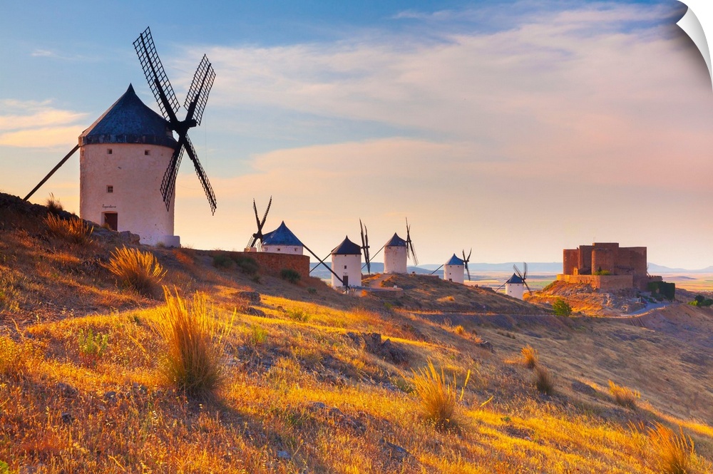 <p>Spain, Castilla-La Mancha, Consuegra, Windmills and the castle near the village, sunrise.</p>