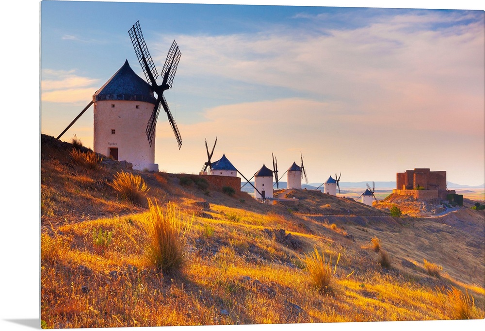 <p>Spain, Castilla-La Mancha, Consuegra, Windmills and the castle near the village, sunrise.</p>