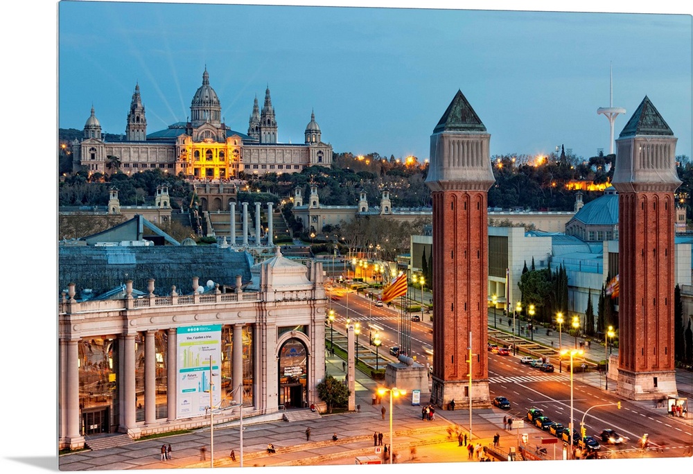 <p>Spain, Catalonia, Barcelona, Barcelona district, Plaza de Espana, The Palau (palace) Nacional de Montjuic which houses the Museu Nacional d'Art de Catalunya in the background and the Venetian Towers</p>
