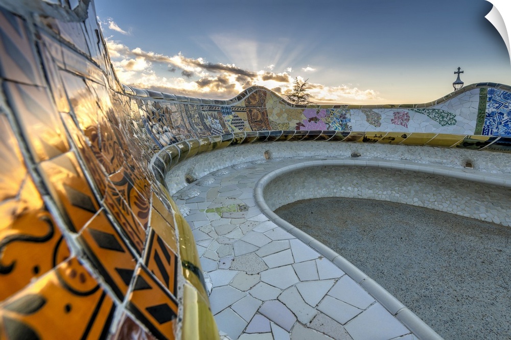 <p>Spain, Catalonia, Barcelona, Parc Guell, Mediterranean sea, Barcelona district, Iberian Peninsula, Tiled serpentine bench by Antoni Gaudi.</p>