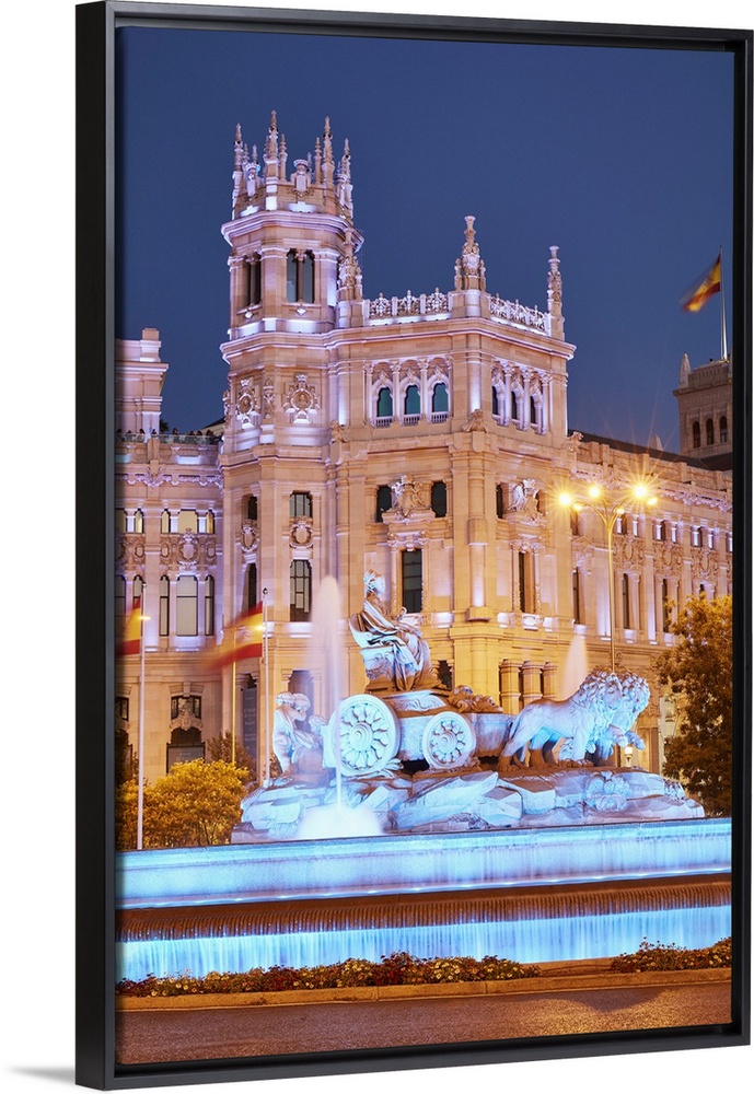 <p>Spain, Comunidad de Madrid, Madrid, Plaza de Cibeles, Plaza de Cibeles (The Cibeles Fountain) and the Palacio de Correos illuminated at night.</p>