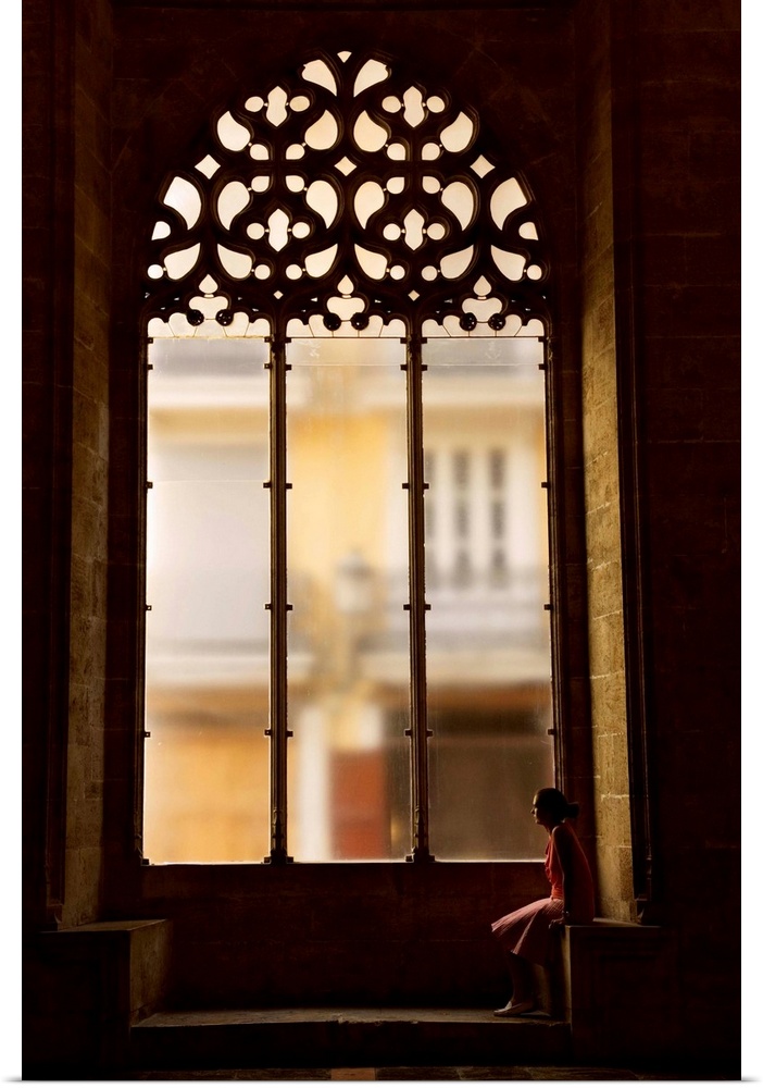 <p>Spain, Comunidad Valenciana, Valencia, Hall of Lonja de La Seda, Woman sitting by a window</p>