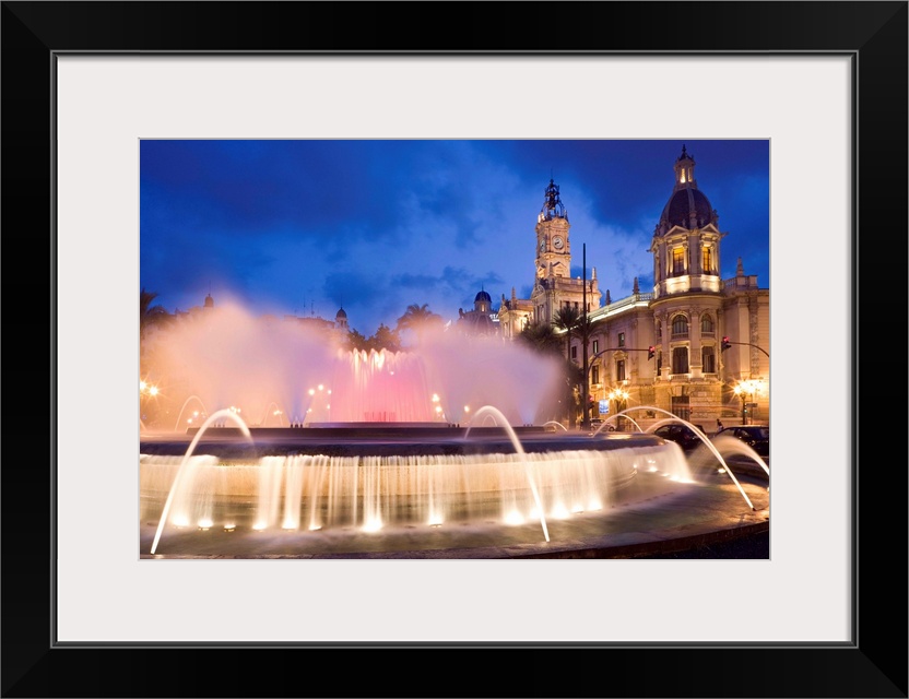 <p>Spain, Comunidad Valenciana, Valencia, Plaza del Ayuntamiento, fountain and town hall</p>