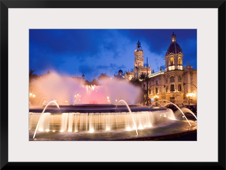 <p>Spain, Comunidad Valenciana, Valencia, Plaza del Ayuntamiento, fountain and town hall</p>