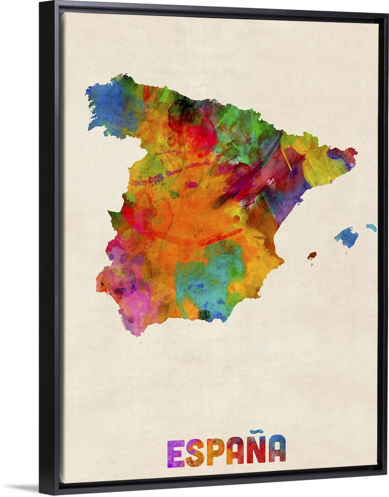 <p>Contemporary piece of artwork of a map of Espana made up of watercolor splashes.</p>
