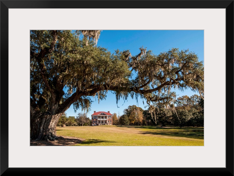 <p>Spanish moss covered tree and the Drayton Hall 18th-century plantation house, Charleston, South Carolina.</p>