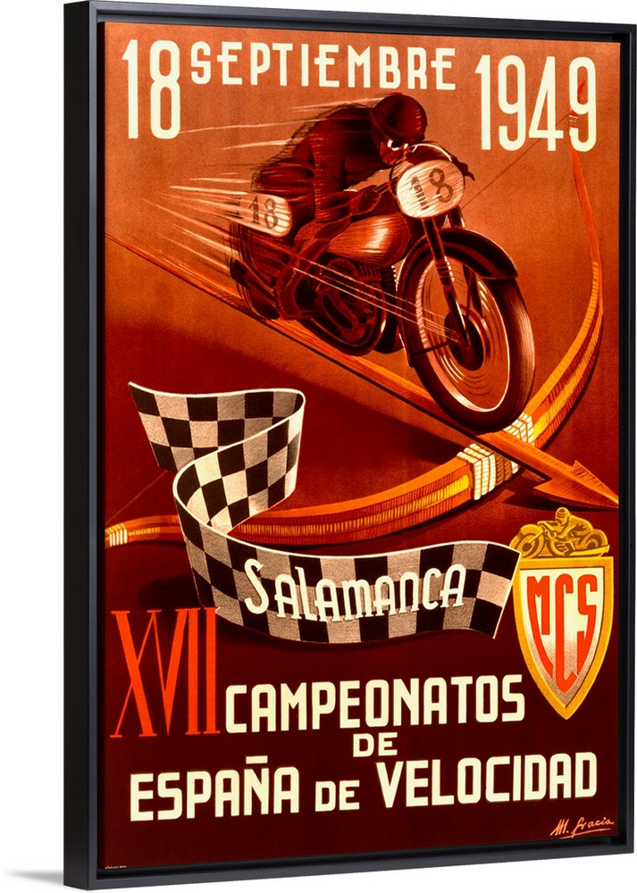 <p>Spanish Speed Championship 1949. This image was to advertise the 17th annual motorcycle speed runs of Salamanca, Spain. The huge design makes the speed effect to be almost real.</p>