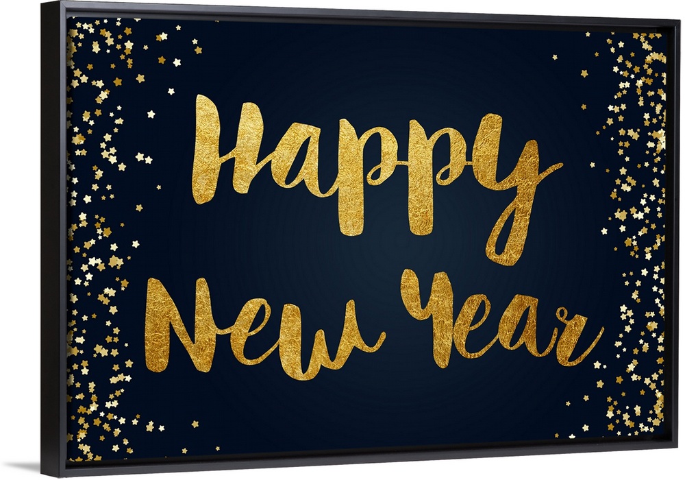 <p>Graphic New Year's art in glittery gold on a navy blue background with gold stars on the sides.</p>