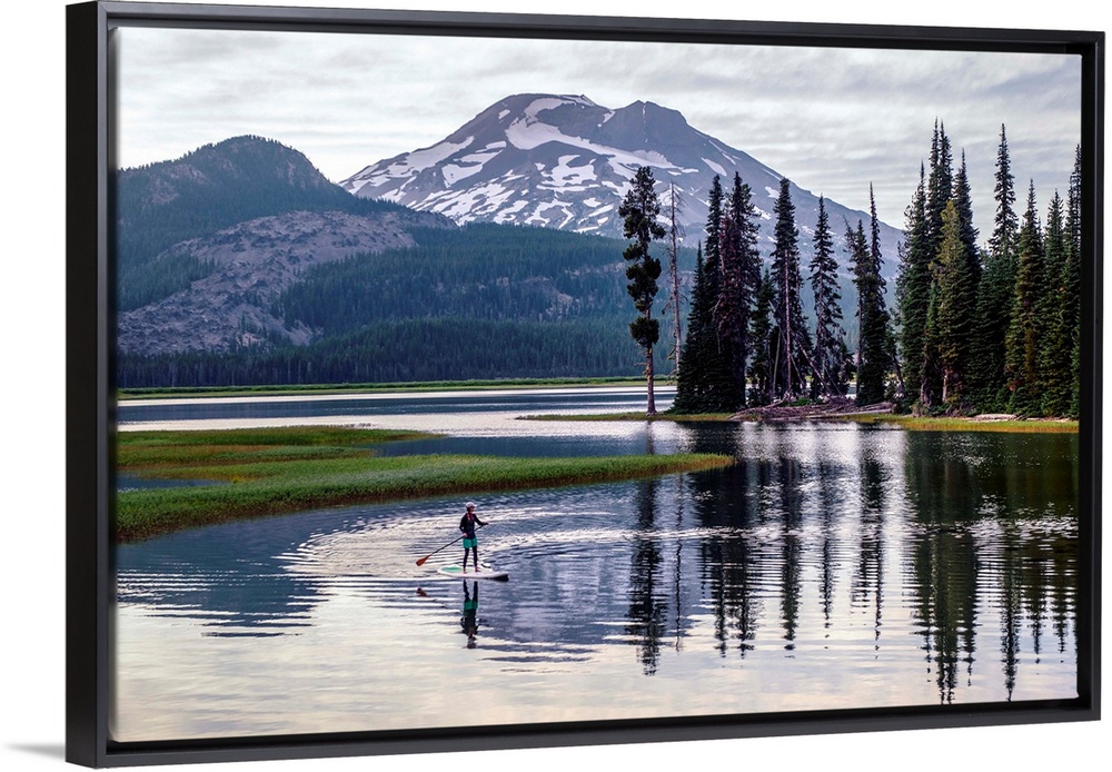 <p>View of a paddle board surfer at Sparks Lake with South Sister peak in the background, Deschutes National Forest in Oregon.</p>