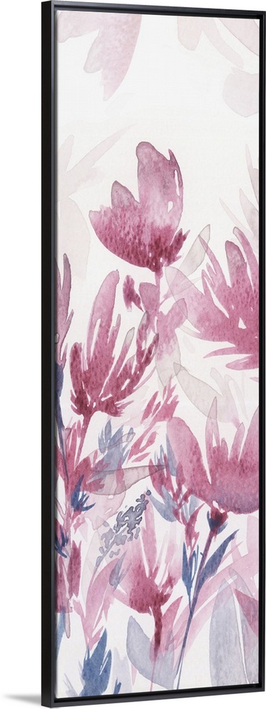 <p>Skinny panel watercolor painting of abstract flowers in pink and blue tones on a white background.</p>