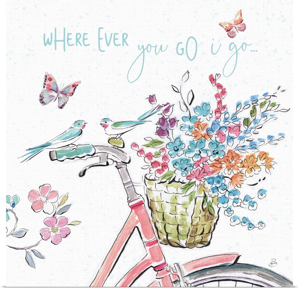 <p>Decorative artwork of an illustrated bike with flowers and the words, 'Where ever you go, I go...' above it.</p>