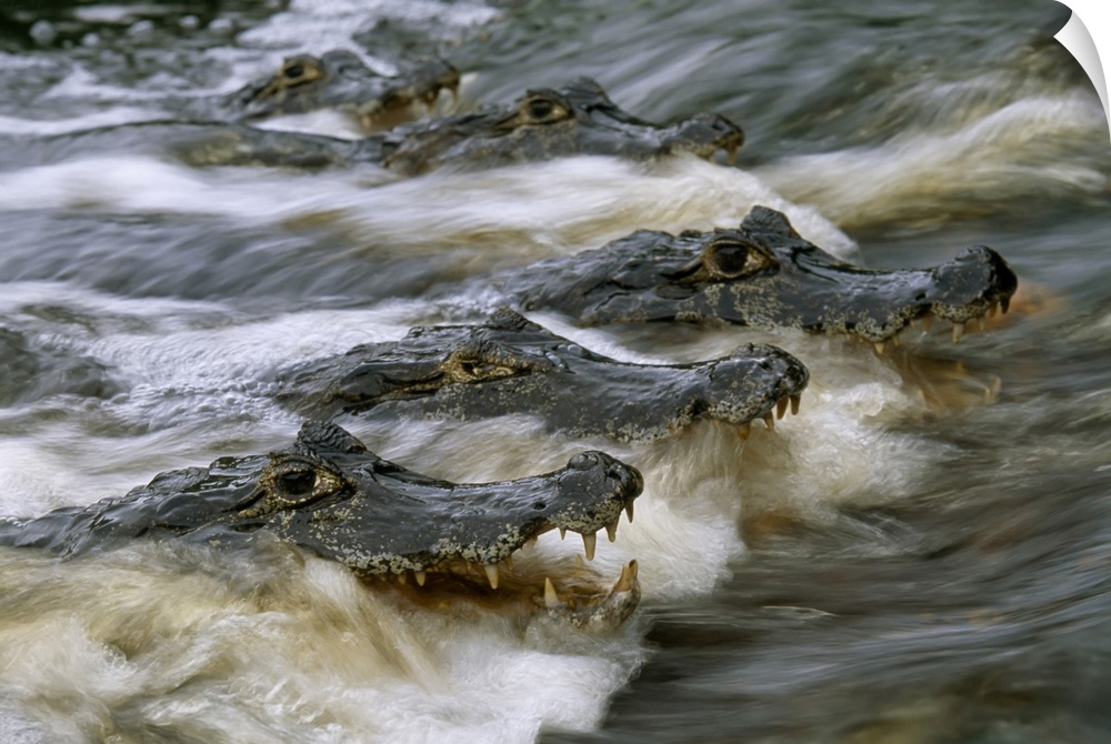 <p>Speckled caimans (caiman crocodilus) swimming in rushing river water. Pantanal, Brazil.</p>