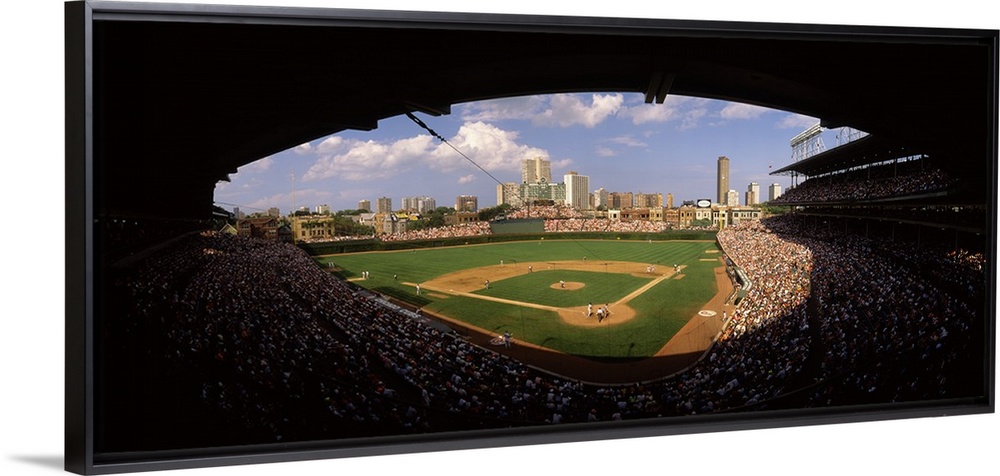 <p>Panoramic photograph taken from a section way behind home plate shows the historic ballpark and stands for a National League Major League Baseball team within the Midwestern United States. Over the ivy covered walls in the outfield and bleachers behind them, the skyline of this busy city can be seen across the horizon.</p>