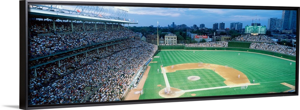 <p>Panoramic shot of Wrigley Field and the baseball diamond during a game as the crowd cheers.</p>