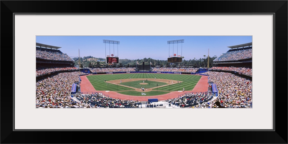 <p>Panoramic photograph of inside baseball stadium with game in full swing. The stands are packed with fans.</p>