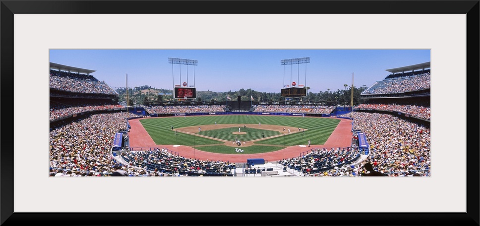 <p>Panoramic photograph of inside baseball stadium with game in full swing. The stands are packed with fans.</p>