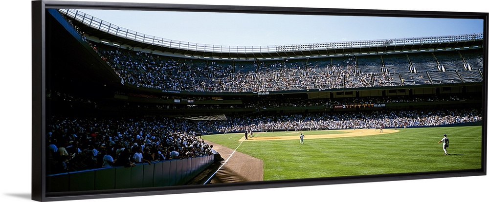 <p>Wide angle photograph of Yankee Stadium with stands full of fans, during a baseball game in New York City.</p>