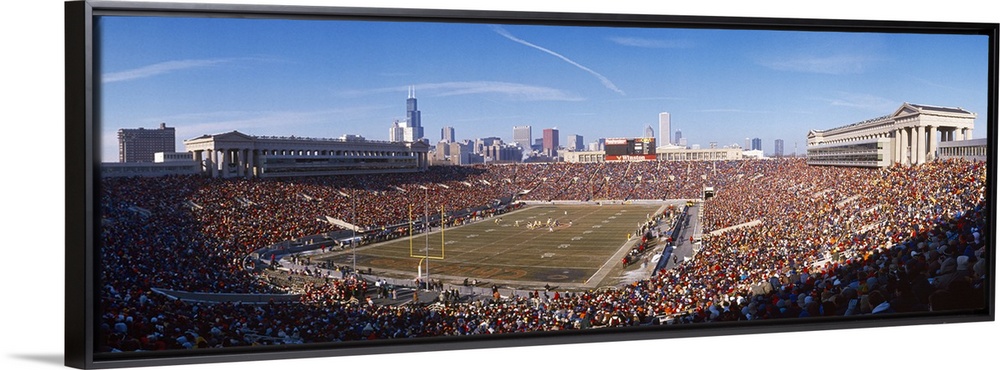 <p>A crowded stadium full of sports fans ready to watch the Chicago Bears game under a clear blue sky, with the city skyline in the distance.</p>