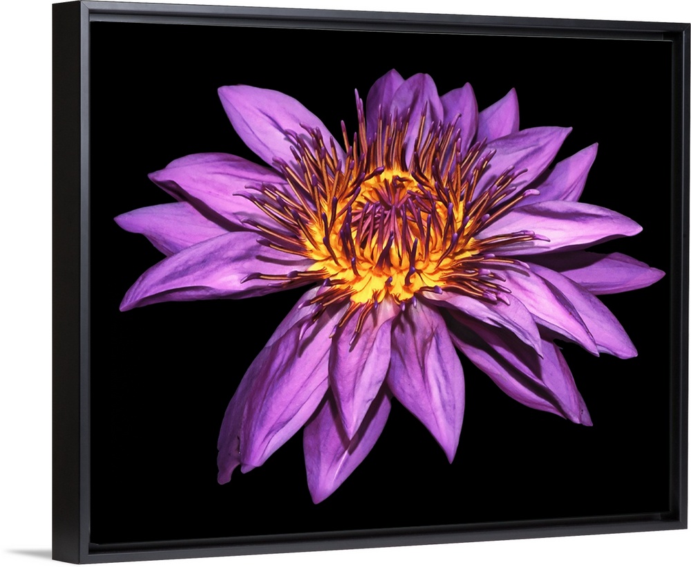 <p>Photograph of a large blooming purple water lily on a dark solid background.</p>