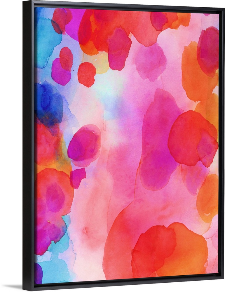 <p>A vertical abstract watercolor painting in brilliant colors of pink, orange and blue.</p>