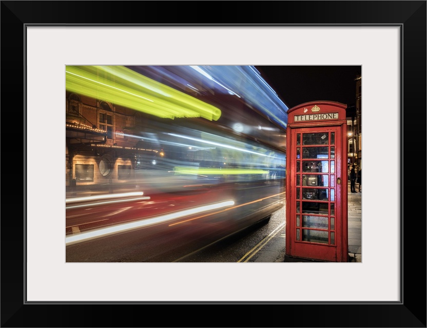 <p>An artistic photograph of telephone booth in London at the edge of a city street with bright neon light trails speeding by.</p>