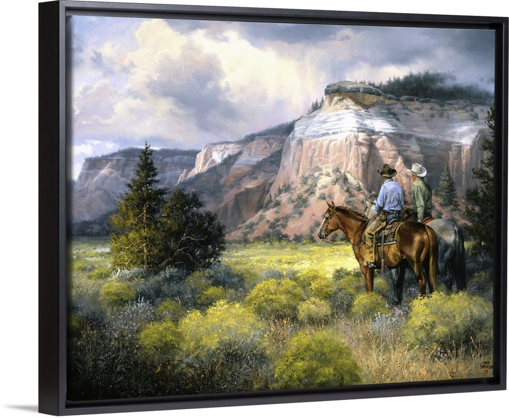 <p>This contemporary artwork of two cowboys seeing the wondrous plains for the first time reminds one of the simple times during yesteryear.</p>