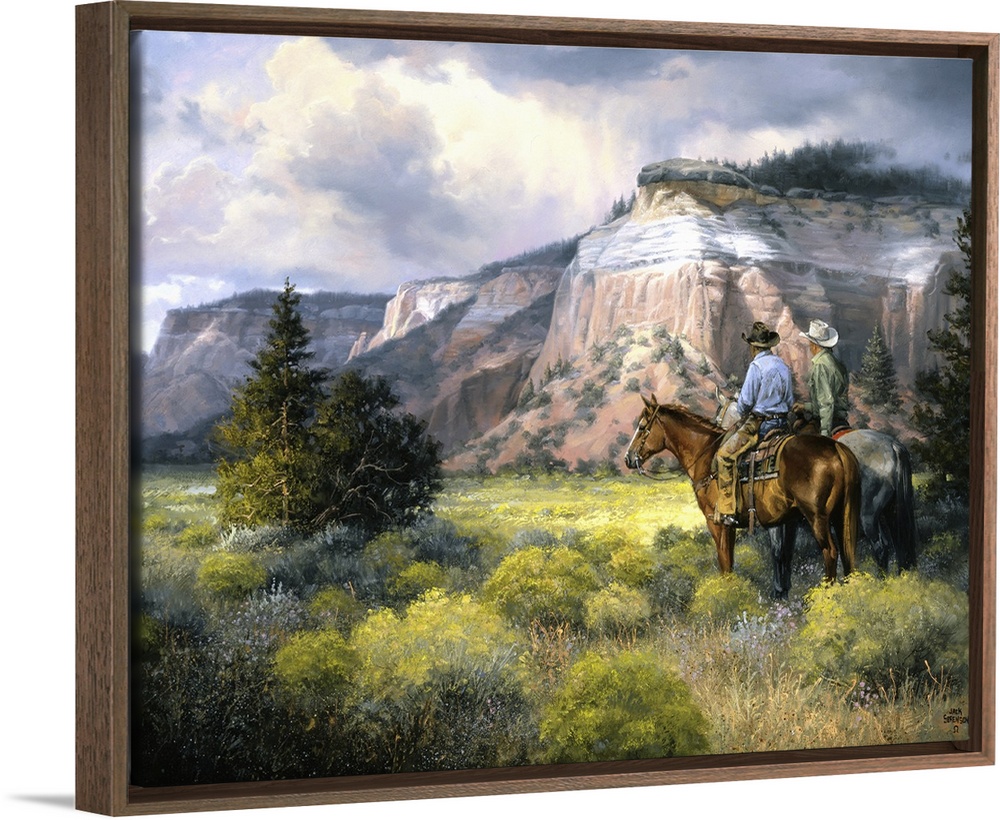 <p>This contemporary artwork of two cowboys seeing the wondrous plains for the first time reminds one of the simple times during yesteryear.</p>