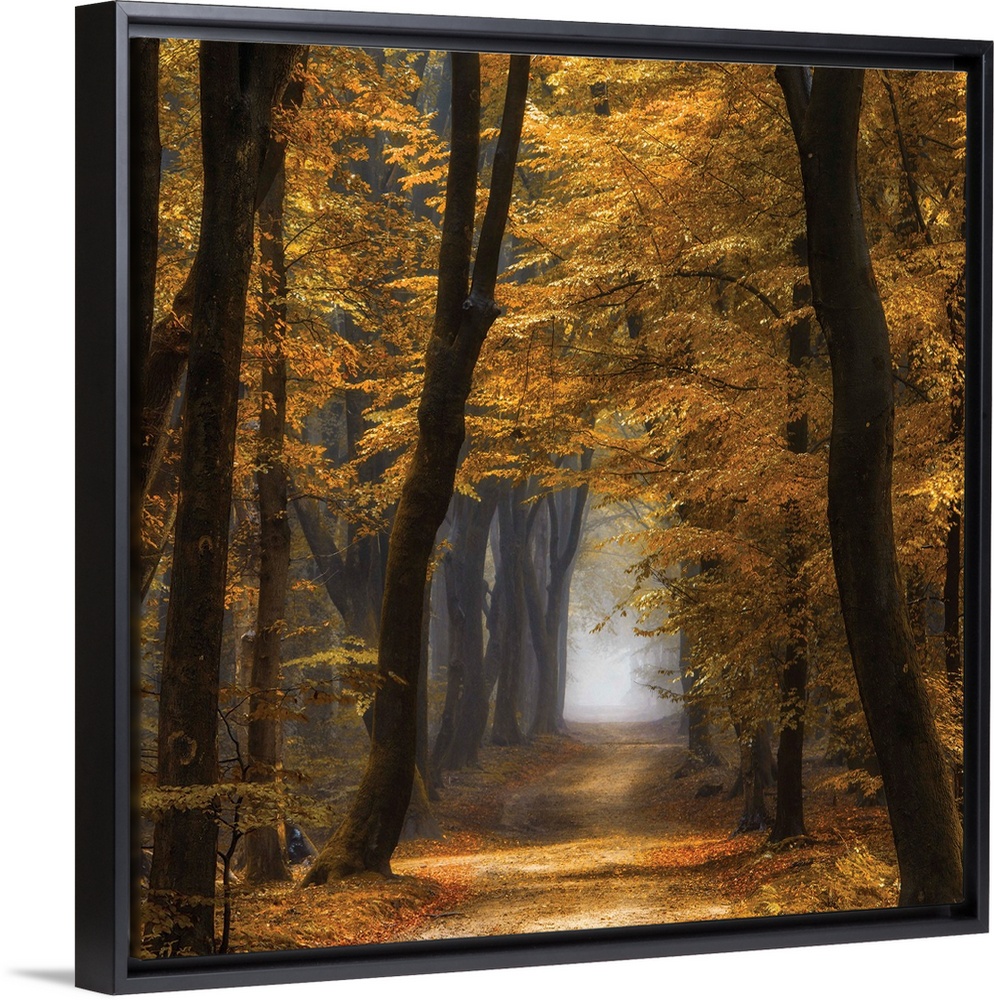 <p>Square photograph of an Autumn forest landscape with golden trees and a foggy pathway running through the middle.</p>