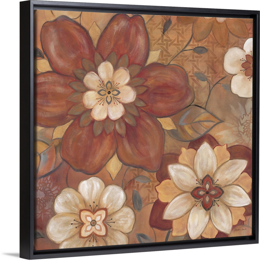<p>Folk art style painting of several differently shaped flowers in rusty red tones.</p>