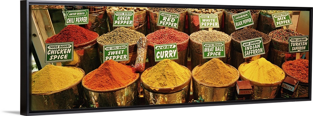 <p>Panoramic image on canvas of buckets of different spices for sale in Turkey.</p>
