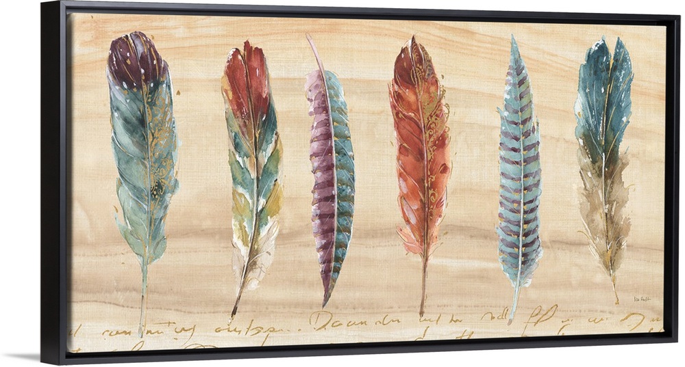 <p>Contemporary painting of a bird feathers laying on a wood plank in warm tones of brown, red and blue.</p>
