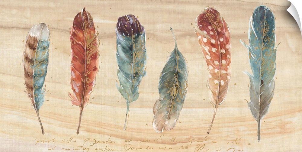 <p>Contemporary painting of a bird feathers laying on a wood plank in warm tones of brown, red and blue.</p>