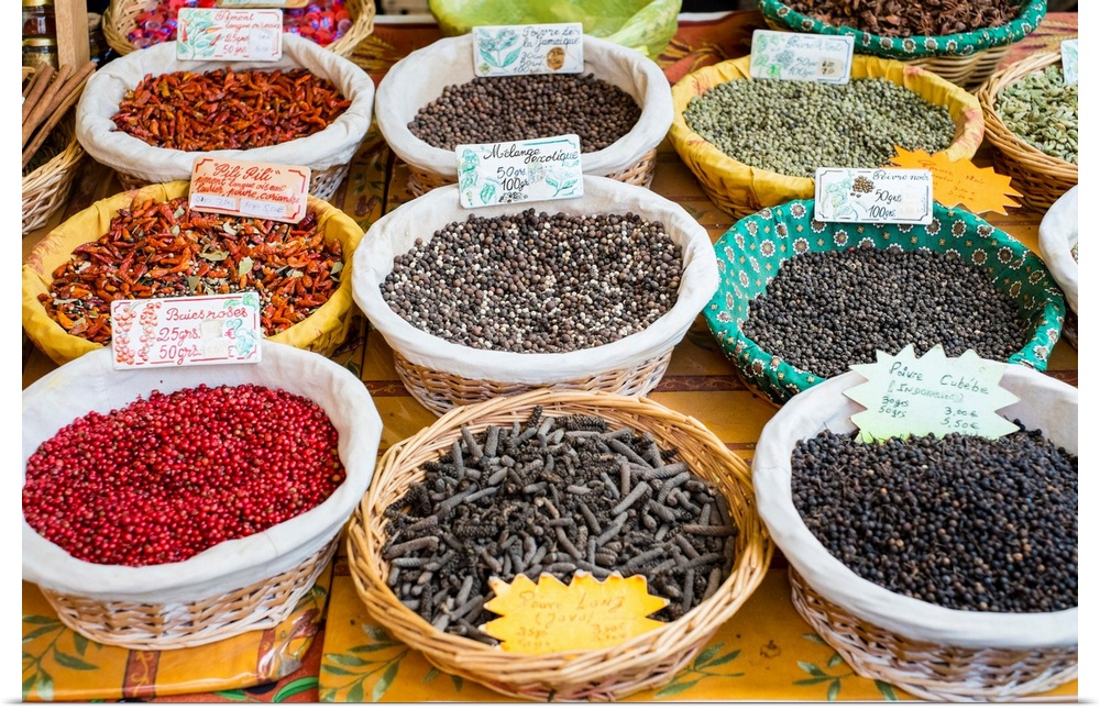 <p>Spices for sale at a French farmer's market on Place des Precheurs, Aix-en-Provence, Bouches-du-Rhone, Provence-Alpes-Cote d'Azur, France.</p>
