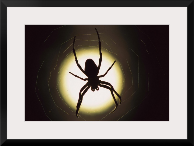 <p>Spider (Araneus sp) silhouetted in its web, native to Europe</p>