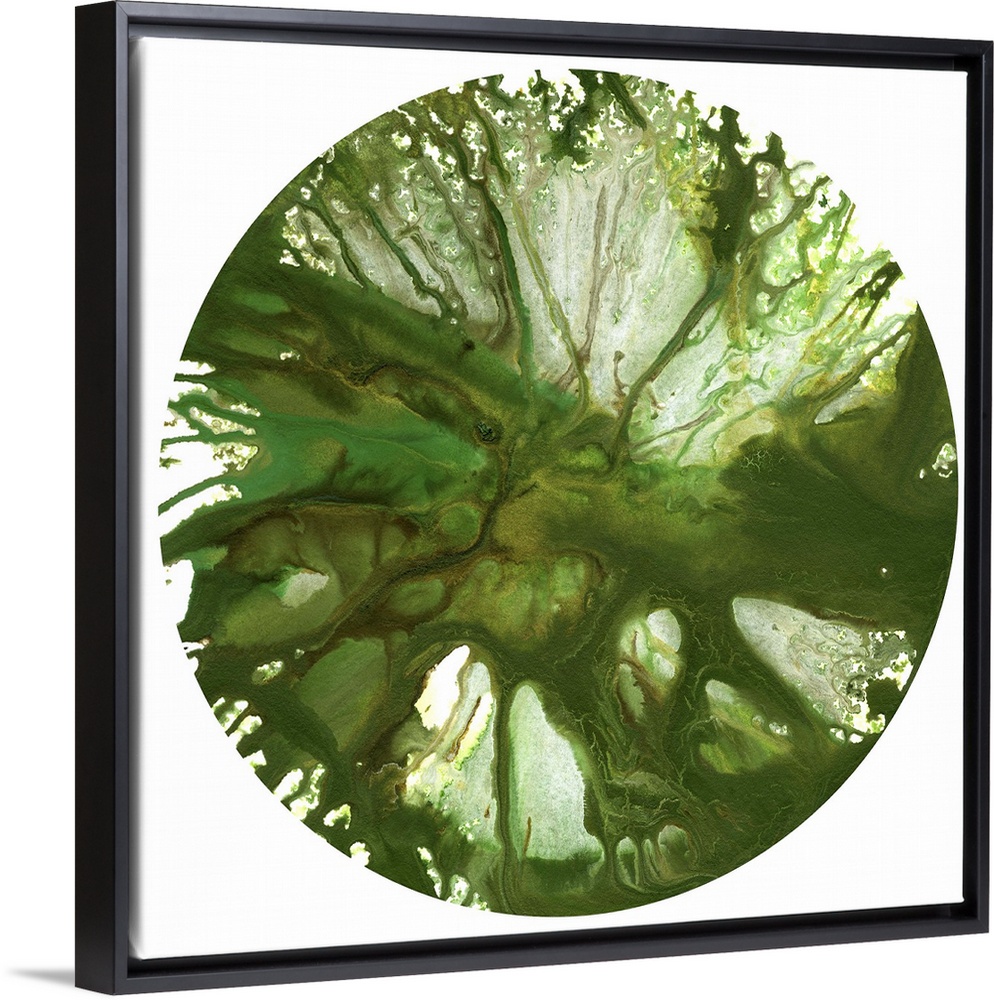 <p>A contemporary abstract painting of spun green paint in a circular formation against a white background.</p>