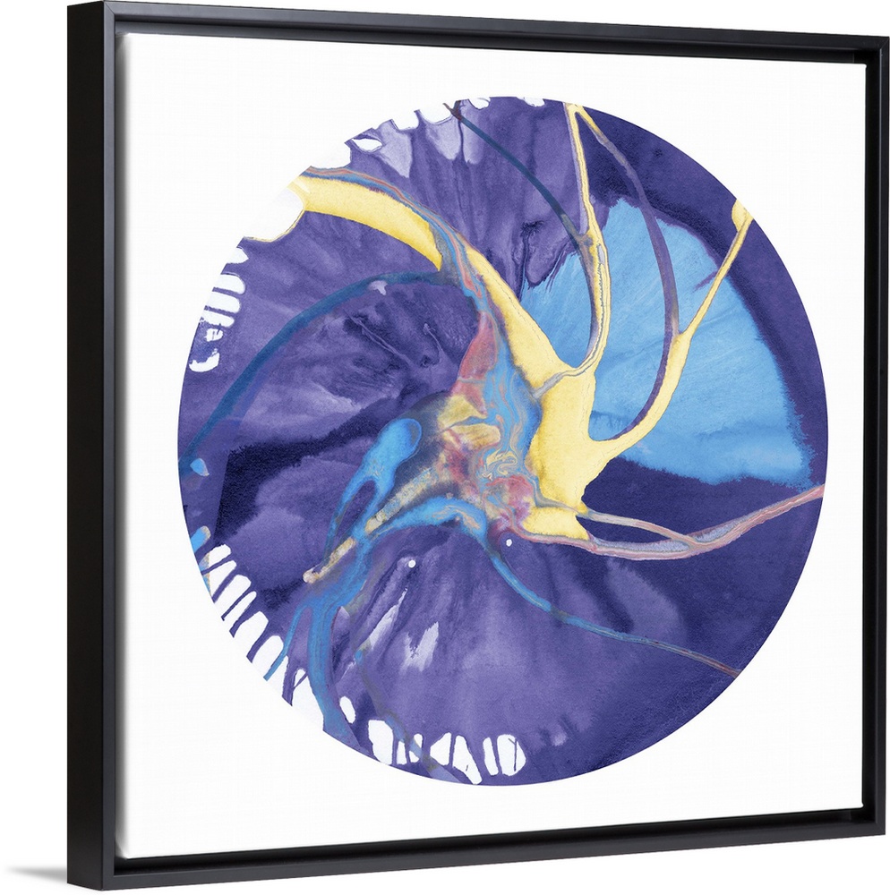 <p>Square abstract spiral spin art inside a circle on white background in shades of purple, blue, yellow, and pink.</p>