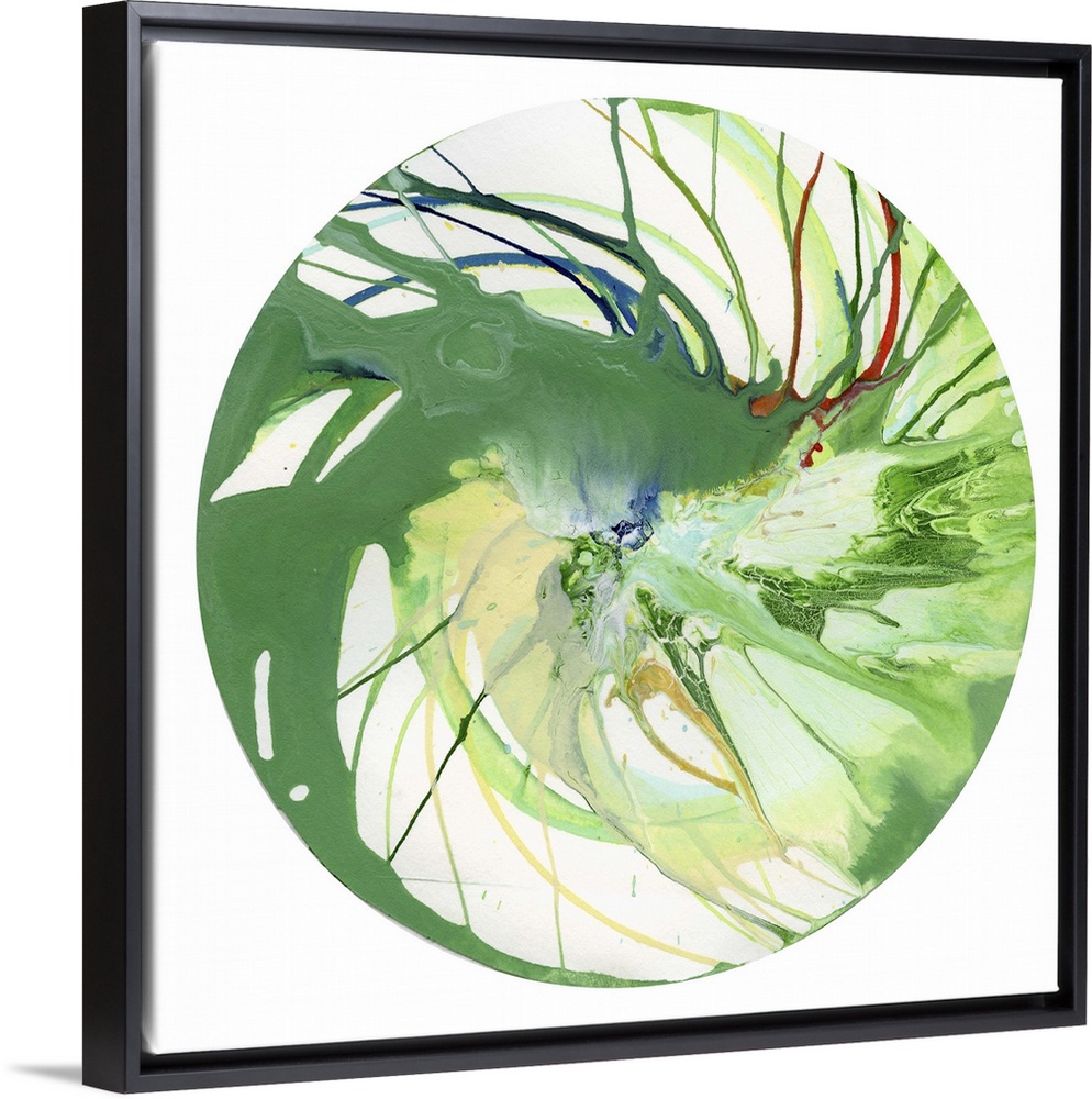 <p>A contemporary abstract painting of spun green and yellow paint in a circular formation against a white background.</p>