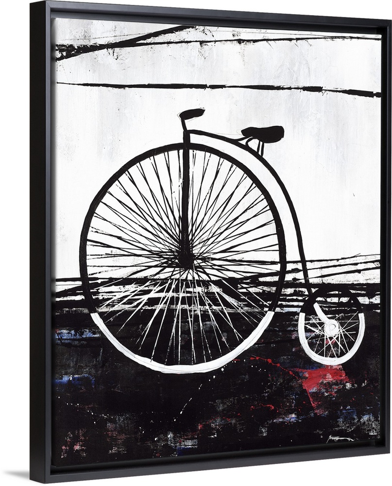 <p>Contemporary painting of a penny-farthing bicycle in black and white with small hints of red and blue on the bottom half.</p>