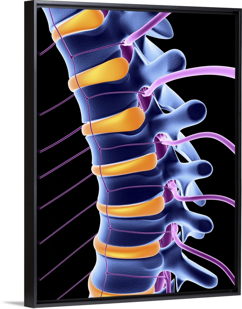 <p>Lower part of the human vertebral column (blue) showing the spinal nerves (mauve) and intervertebral discs (yellow).Through the spinal nerves messages from the brain to the body and from the body to the brain are relayed. If a discs bulge out and presses against the spinal cord or one of its nerve branches, pain and numbness are typical symptoms. In rare cases damage to the spinal cord can cause partial paralysis.</p>