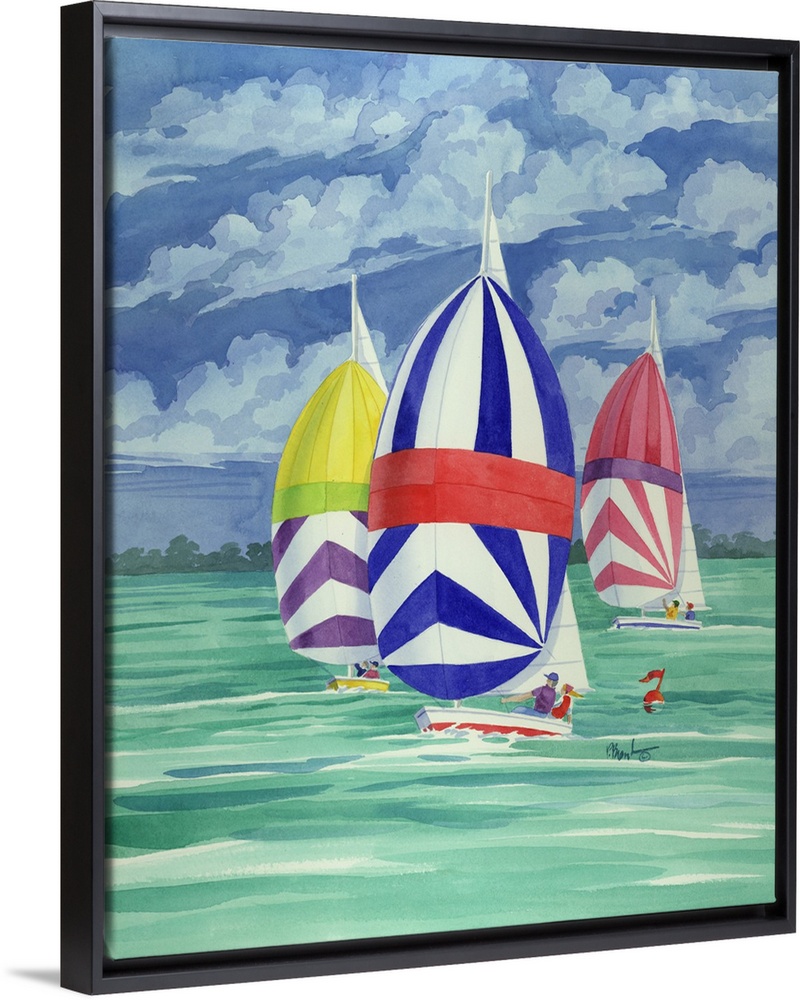 <p>Contemporary painting of three spinnaker boats with striped sails on the water.</p>