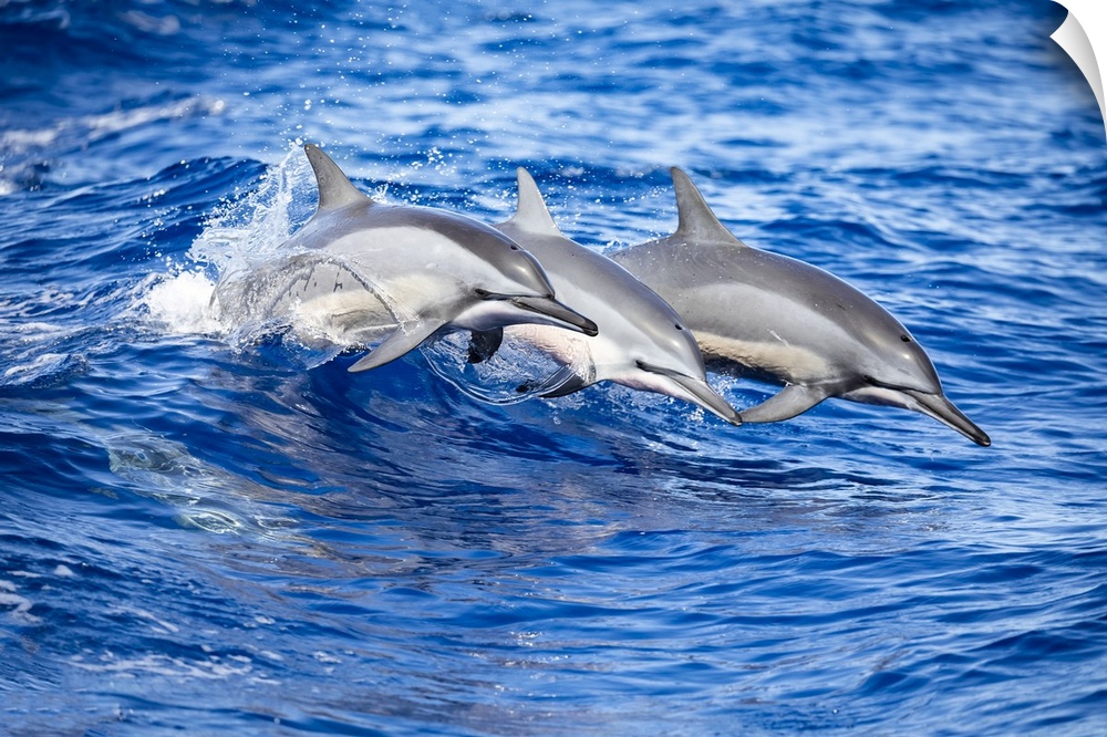 <p>Three spinner dolphins (Stenella longirostris) leap out of the Pacific Ocean off the island of Lanai; Lanai, Hawaii, United States of America</p>