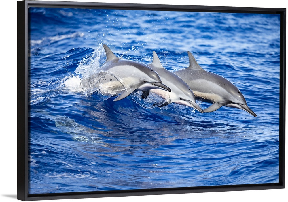 <p>Three spinner dolphins (Stenella longirostris) leap out of the Pacific Ocean off the island of Lanai; Lanai, Hawaii, United States of America</p>
