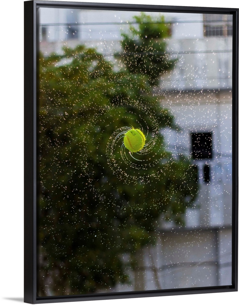 <p>Photograph of a tennis ball spinning with water streaming off it.</p>