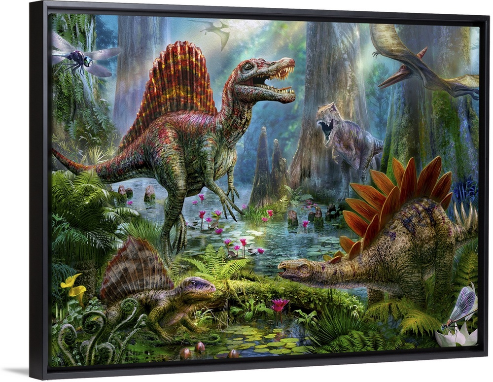 <p>Colorful artwork of a dinosaurs in a tropical paradise.</p>