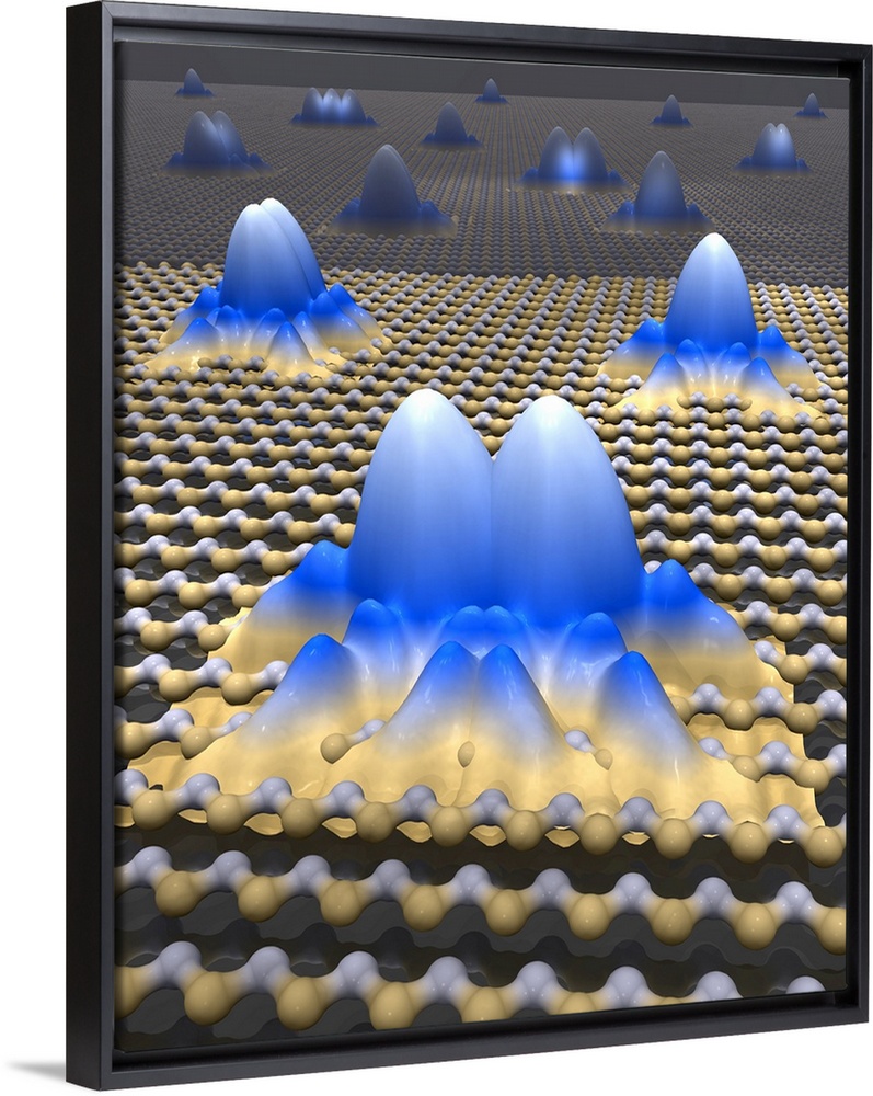 <p>Spintronics research. Composite coloured scanning tunnelling micrograph (STM) showing ferromagnetic interactions (blue and yellow) between manganese atoms in a gallium arsenide semiconductor (white and yellow, shown as a molecular model). The spins of the atoms interact via a cloud of electrons. Gallium atoms in the semiconductor have been substituted by manganese atoms using the scanning tunnelling microscope, which allows precise substitution one atom at a time. This creates a magnetic semiconductor that would be able to store data as well as process it. This research is being carried out by Prof. Yazdani at Princeton Nanoscale Microscopy Laboratory (PNML), Princeton University, USA.</p>