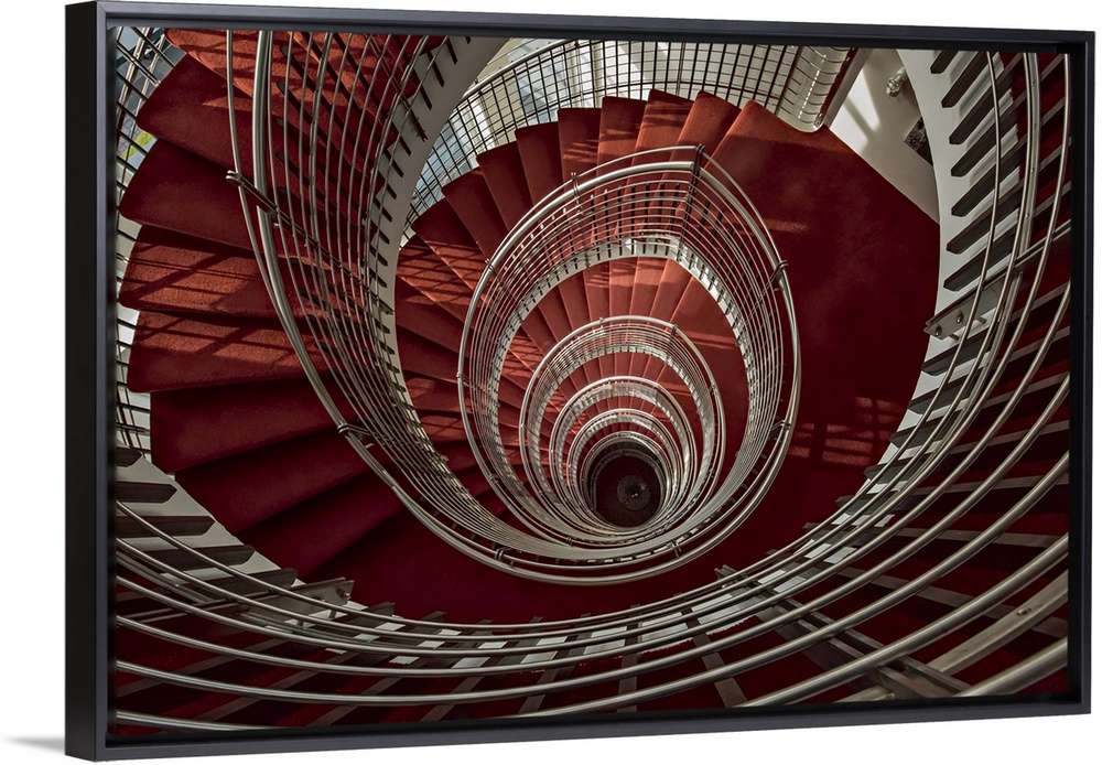 <p>View through the center of a spiral staircase with red steps and white railings.</p>