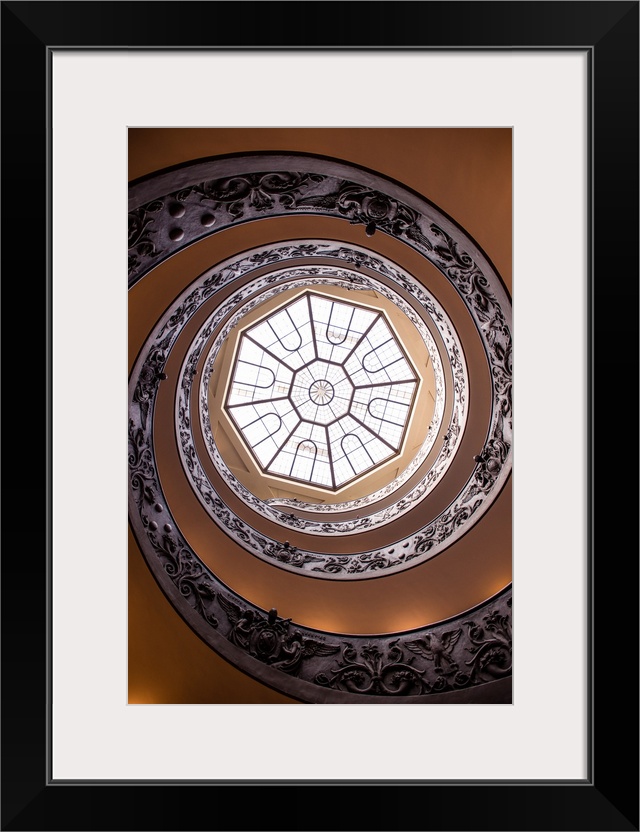 <p>Photograph of the spiral staircase in the Vatican History Museum leading up to the beautiful skylight window.</p>