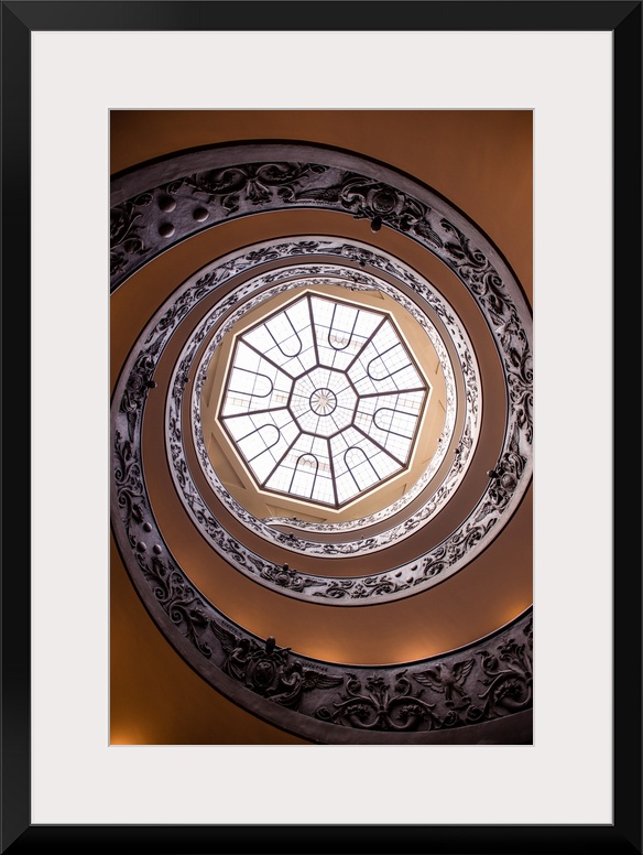 <p>Photograph of the spiral staircase in the Vatican History Museum leading up to the beautiful skylight window.</p>