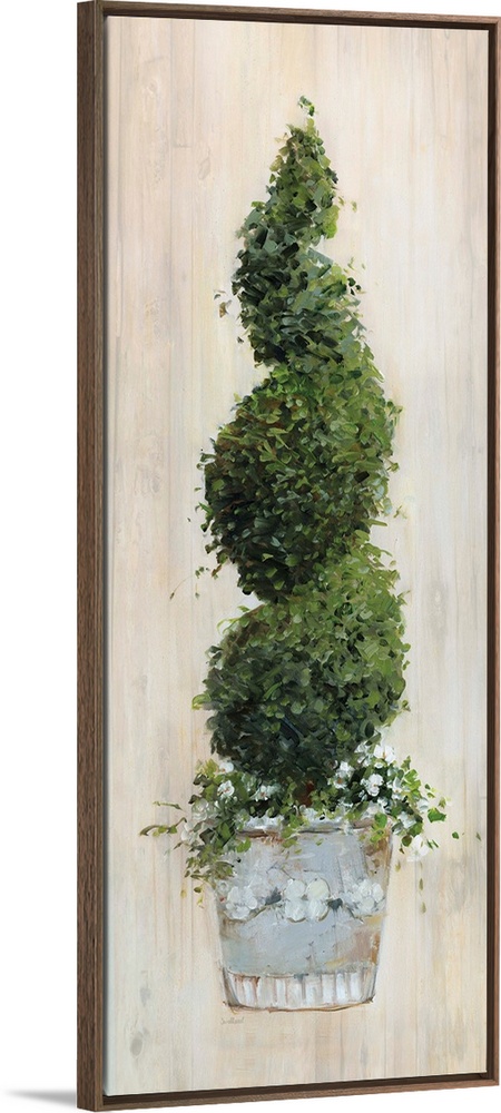 <p>A contemporary still life painting of a spiral topiary with a wood grain background.</p>