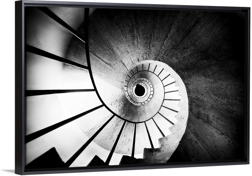 <p>View through the center of a spiral staircase with an iron railing.</p>
